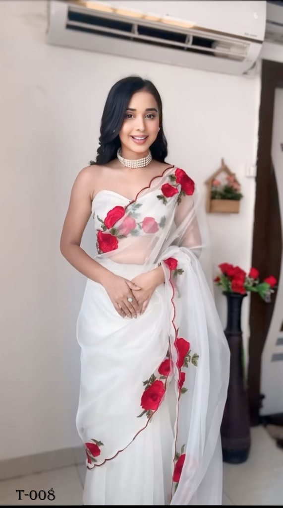 New Design pure soft Organza silk with beautiful embroidery Red colour rose design Ready To Wear saree design in All over the border With beautiful Trendy and grand Beautiful pallu. With Beautiful embroidery Blouse piece