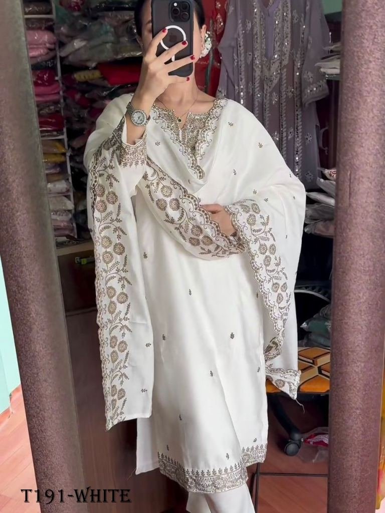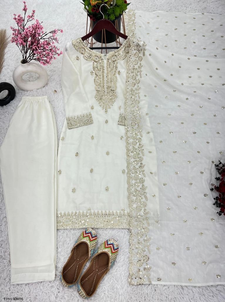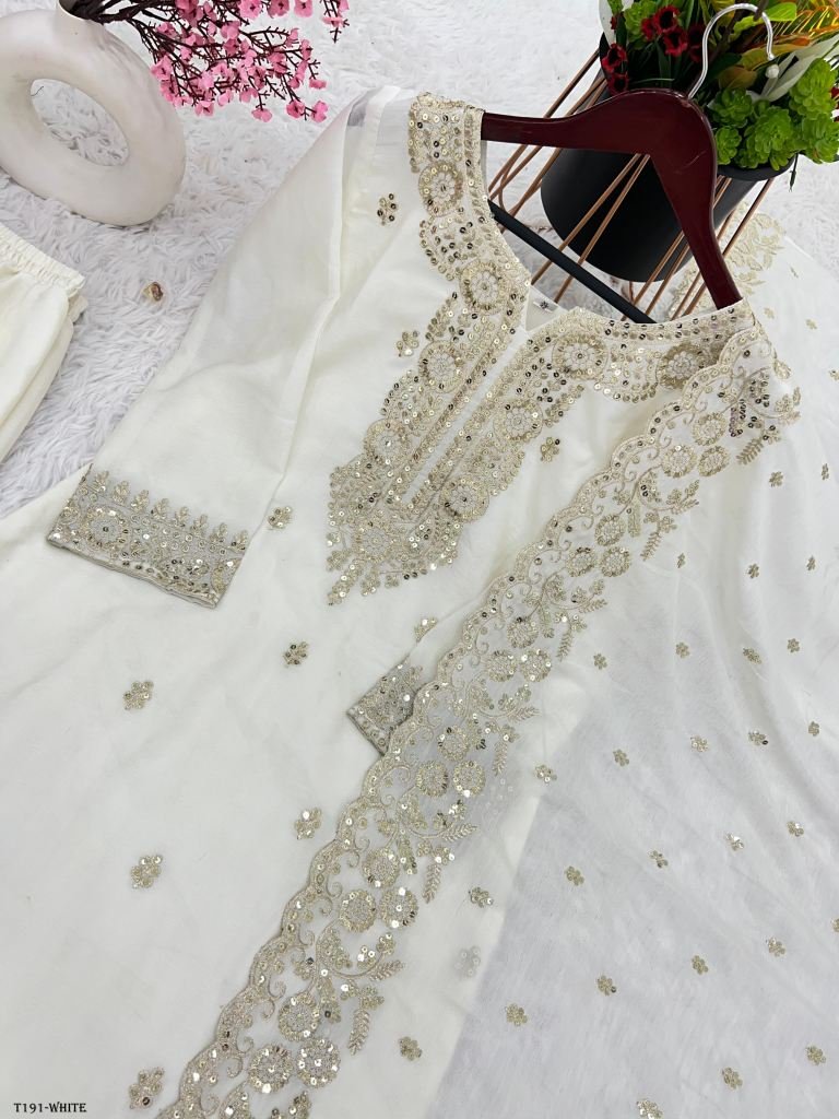 Presenting New Designer Collection In Pure Chinnon With Embroidery Sequence Work Top-Bottom And Dupatta Set Fully Stitched Ready To Wear