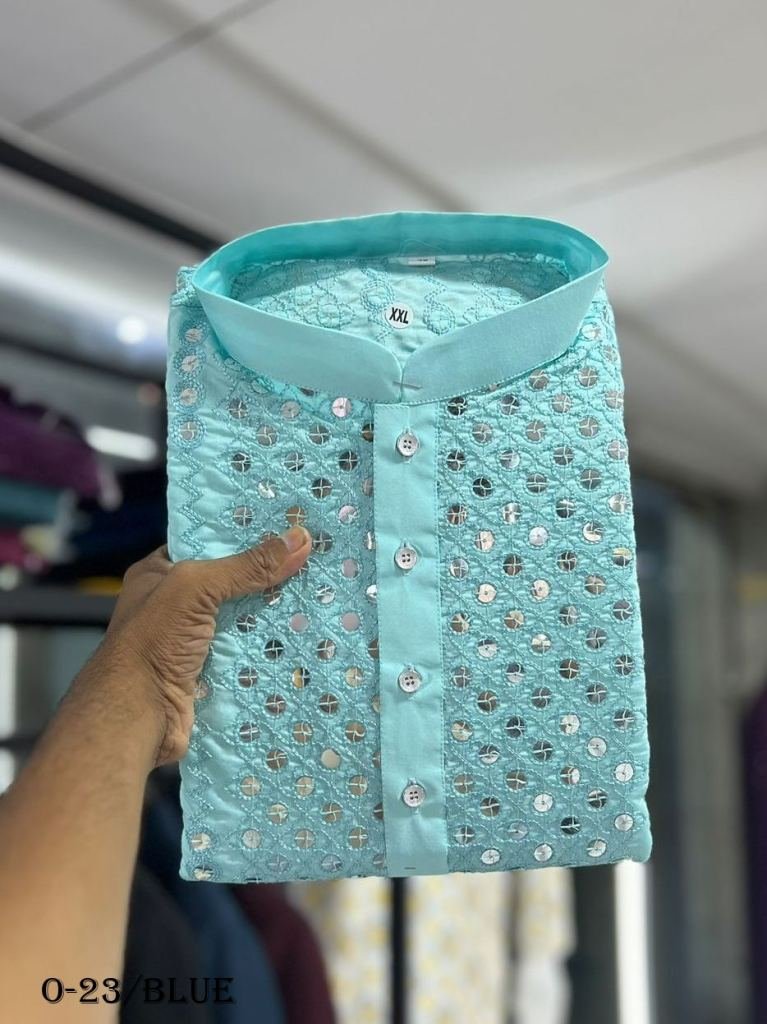 Our Cotton Straight Mens Kurta with Sequin is an exquisite piece of craftsmanship, combining the luxurious appeal of cotton fabric with subtle sequin work to create a garment that speaks of sophistication and refinement. The perfect addition to any wardrobe, this classic style is sure to add a luxurious touch to any look.