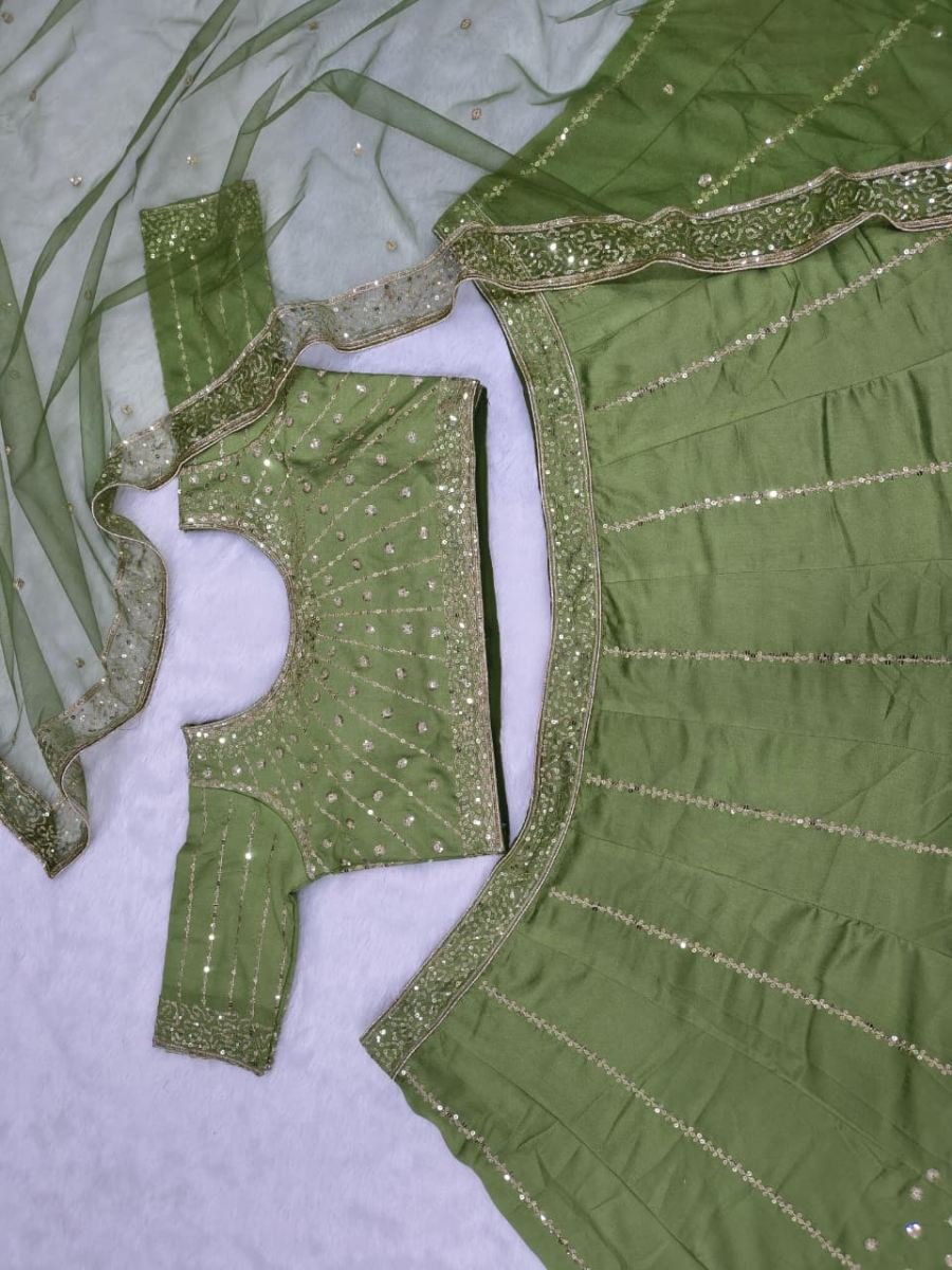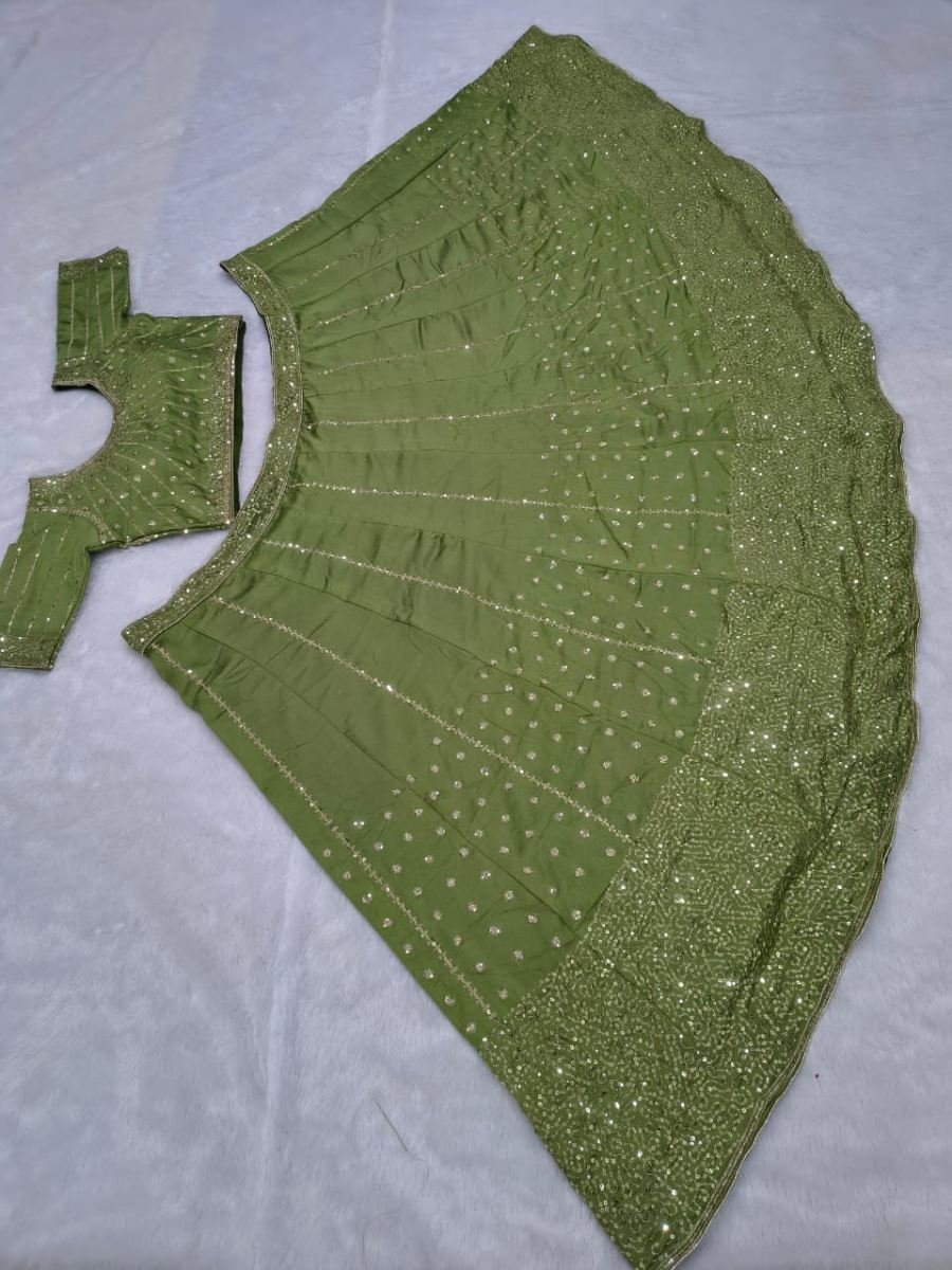 Lehenga: Made from premium Vichitra silk, this lehenga is beautifully decorated with embroidery, jari work, and heavy sequins. It has a heavy cancan layer and inner lining for a full, flowing look, with a 3.5-meter flair. Semi-stitched for easy customization.