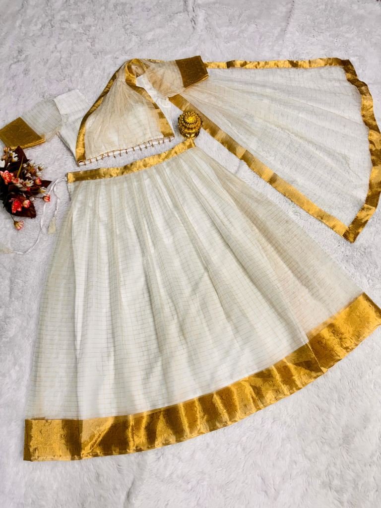 Onam Festive Wear Soft Organza Golden Border Lehenga With Blouse