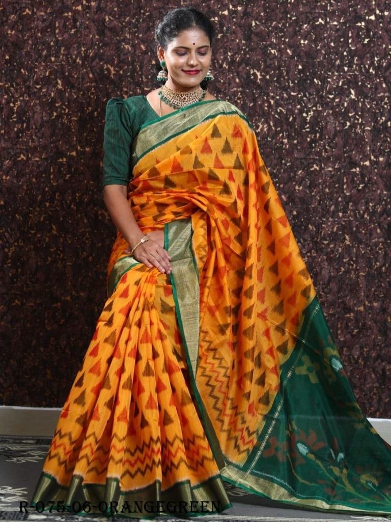 Orange Pramila Ikkat Patola Digital Printed Saree with Green Blouse