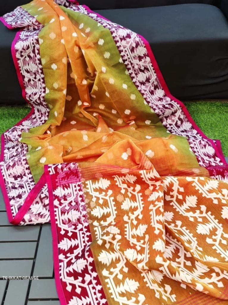 Fabric :- Muslin Pattern :- IkkatColor :- OrangeOccasion :- Wedding, Festival, PartySaree Length :- 5.5Blouse piece :- 0.8