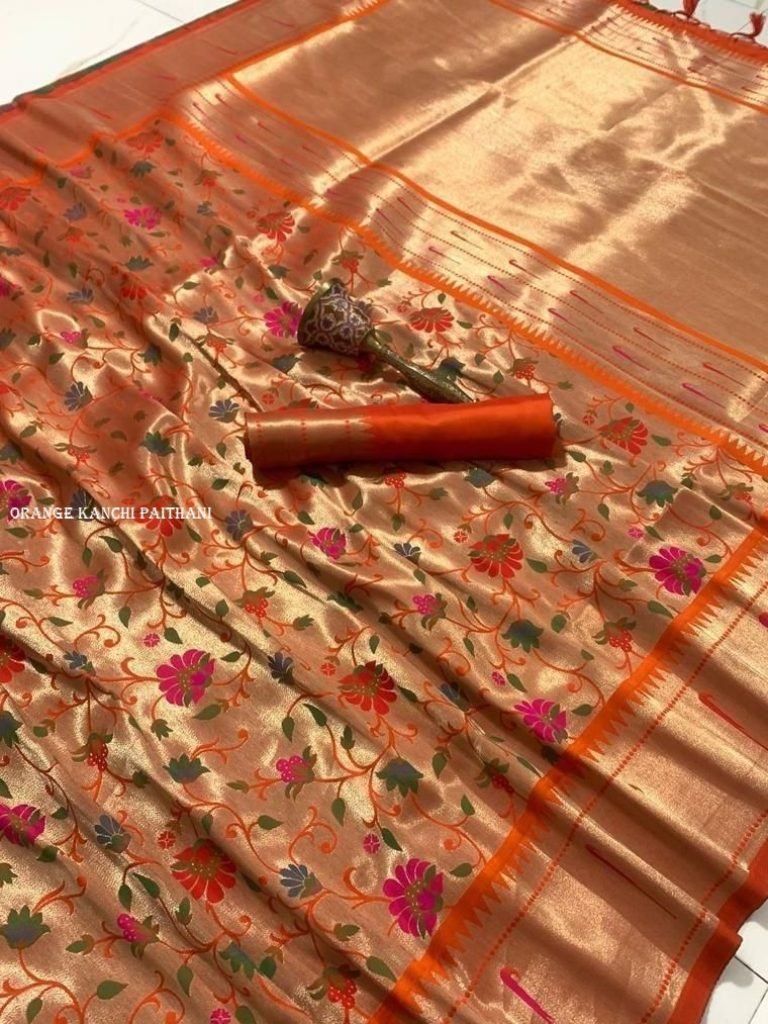 Pure silk sareesFABRIC:-PURE SOFT KANCHIVRAM PETHANI SILKORIGINAL PURE ZARI zal DESIGN AND MINAKARI BORDER AND HEAVY MINA ZARI WEAVING Blouse - Running with zari border