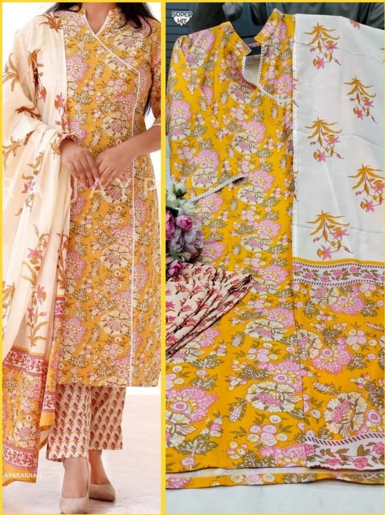 Premium Organic REYON Cotton Angrakha pattern Trendy kurti Pant Dupatta Set with fine lacework On Yoke. Paired up with fine Soft Reyon Cotton Pant And Dupatta.