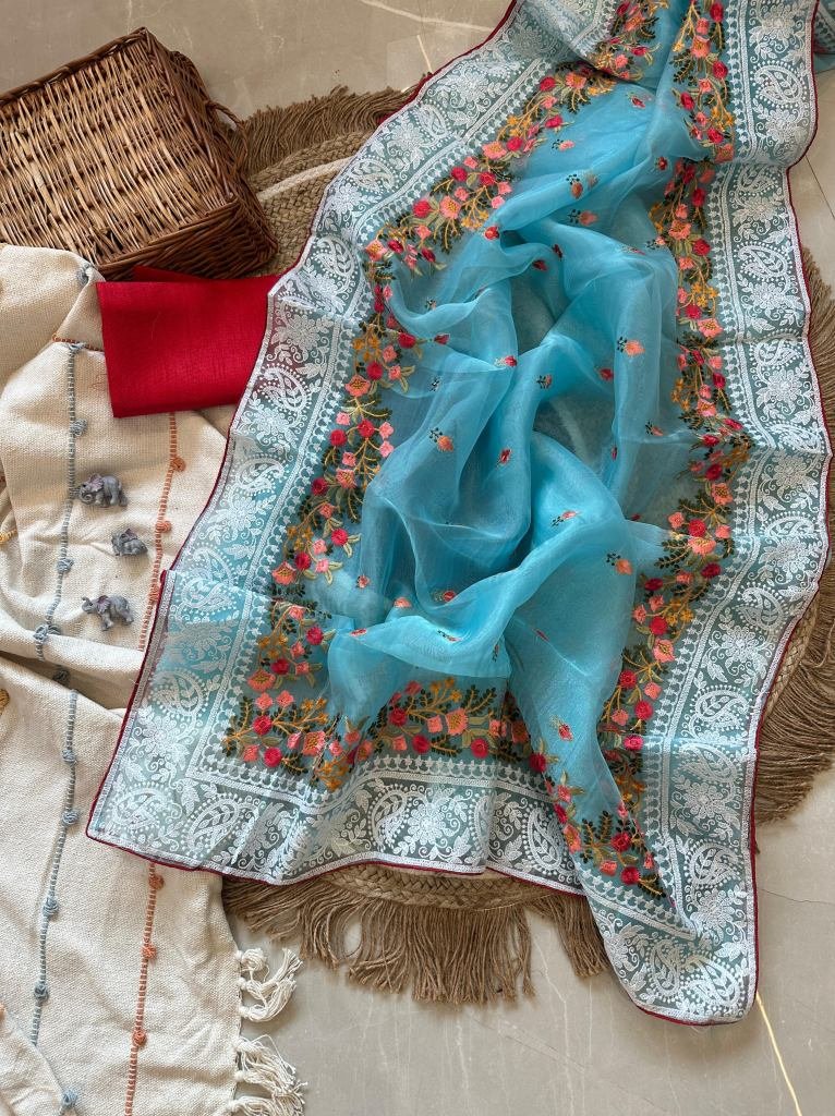 Saree Work : Lucknowi Thread Chikankari Work In Pallu and multiple color work viscos border too and paired with Raw Silk Blouse