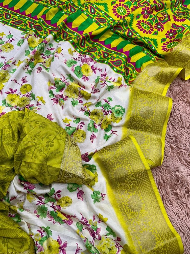 Fabric ;- Dola silkPattern :- PrintedPrint :- FlowerSaree Length :- 5.5Blouse Length :- 0.8