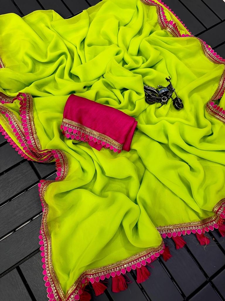 Fabric :- Soft GeorgettePattern :- PlainLace :- Sabyasanchi Saree Length :- 5.50 CUTBlouse :- Bangalory Blouse