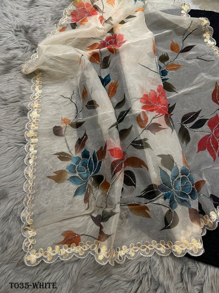 Pure organza saree in floral digital print with handwork in all over saree also attached a beautiful sequence border