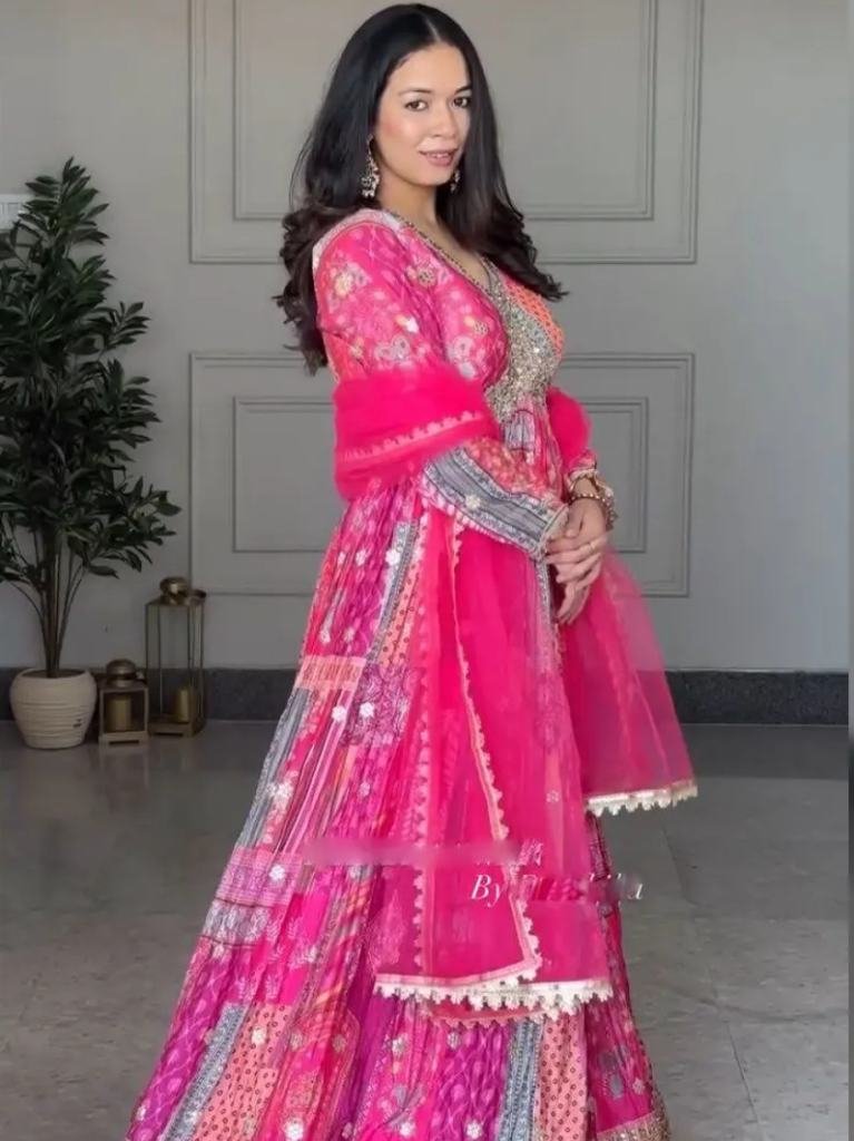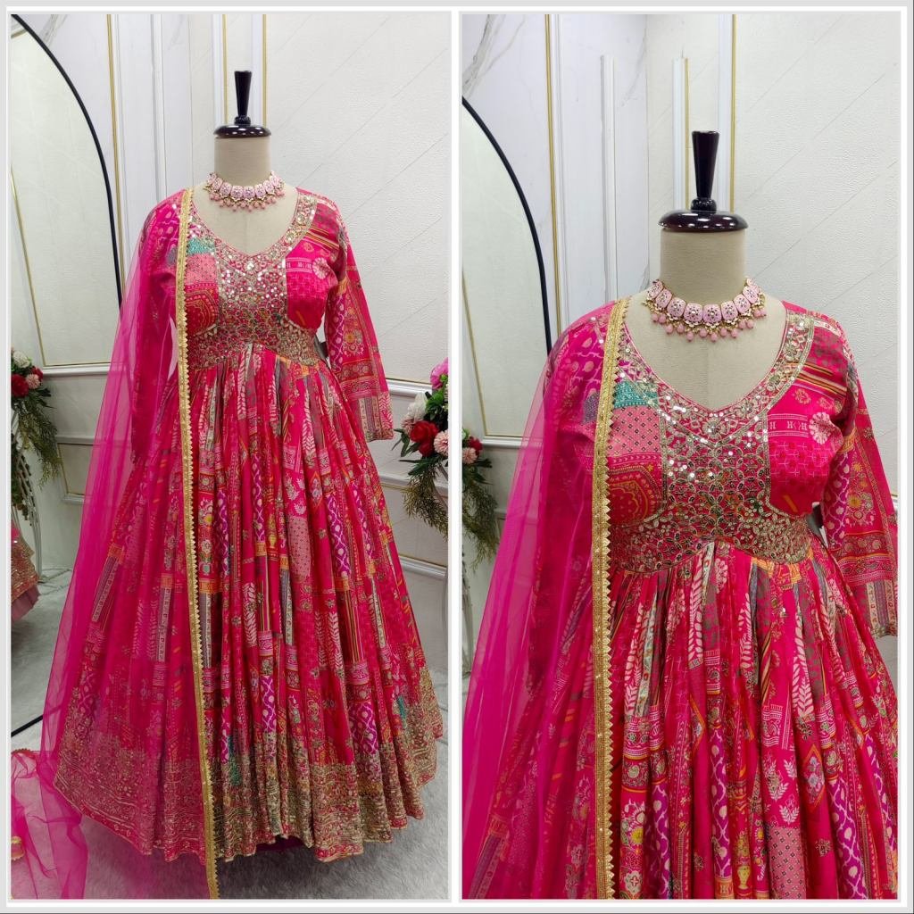 Gwon Fabric : Pure Chinon Silk With Digital Print With Heavy Embroidery 5mm Sequence Work With Sleeve (Attached Ped)