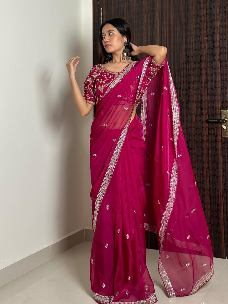 Pure Soft Organza (Tabby Silk) Saree With Heavy Embroidery Zari And 3mm Sequence Work With Ton To Ton Arca Border.