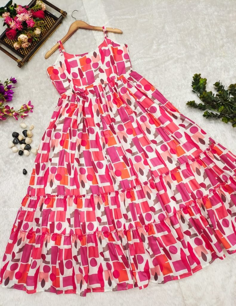 Material:-Muslin Complete LinningLength:- 52"SleevelessFlare 3.5 Mrts MAXISize M-38 L-40 XL-42 XXL-44