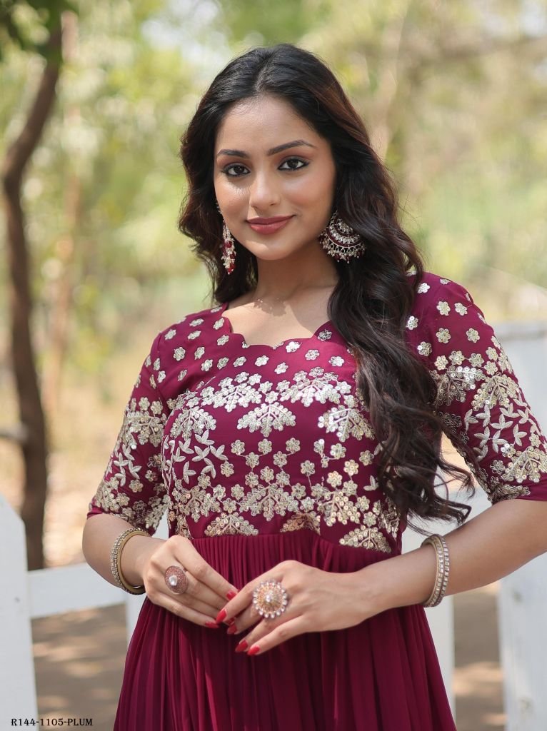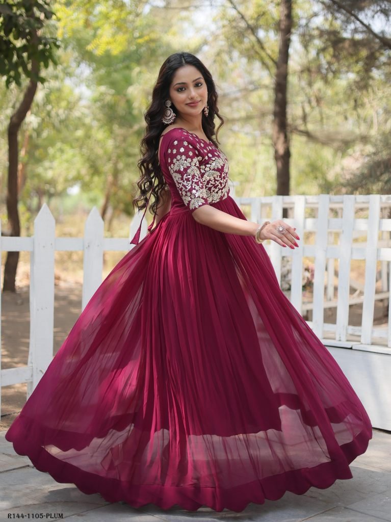 Plum Readymade Designer Embroidery Zari Work Gown