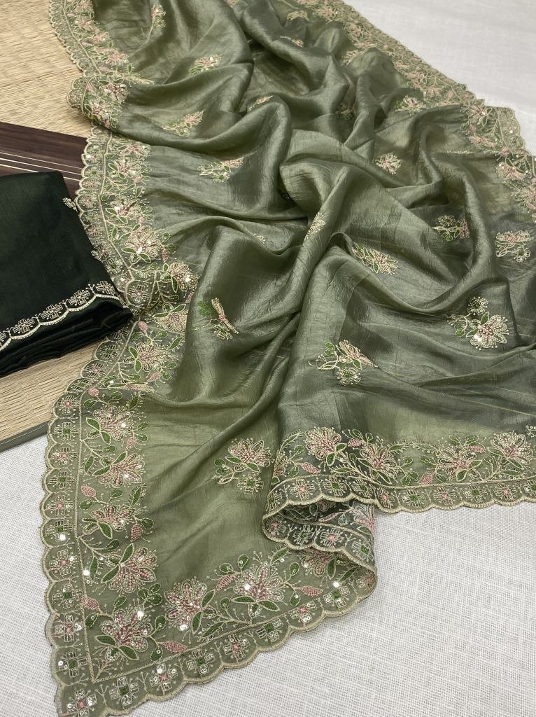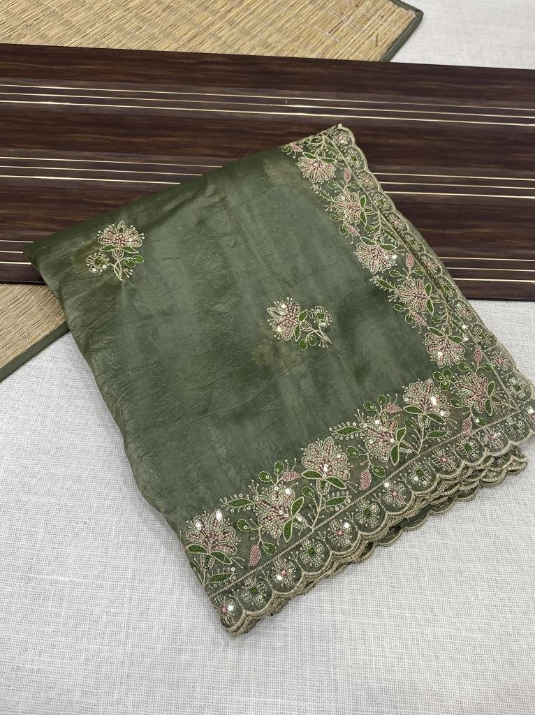 • Soft Gold Crush Fabric Saree with Embroidery Work