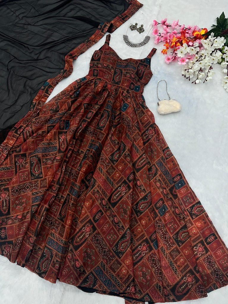 Anarkali Gown - Pure Jimmy Organza Silk Digital Printed Padded Gown With 52+ Gown Length 8mtr Flair Outfit Dupatta - Georgette 2mtr Dupatta Sizes - 34,36,38,40,42 (Margin Available For 44)