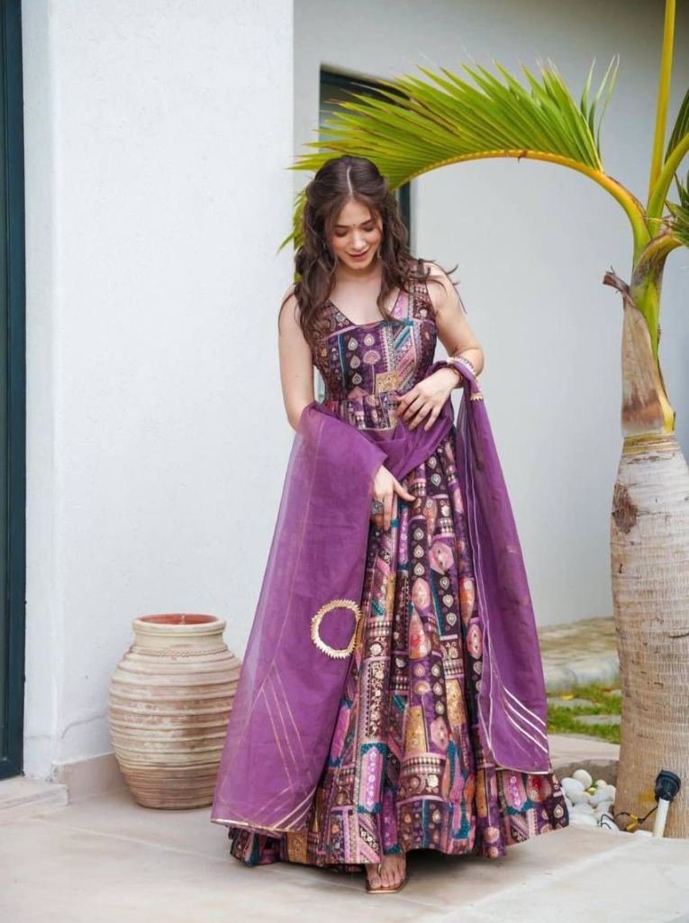 DETAILSMaterial :- Chinnon Silk Complete LinningLength :- 50"Sleeves length :- 20 inchesDupptta fabric :- Organza Bottom Fabric :- Micro