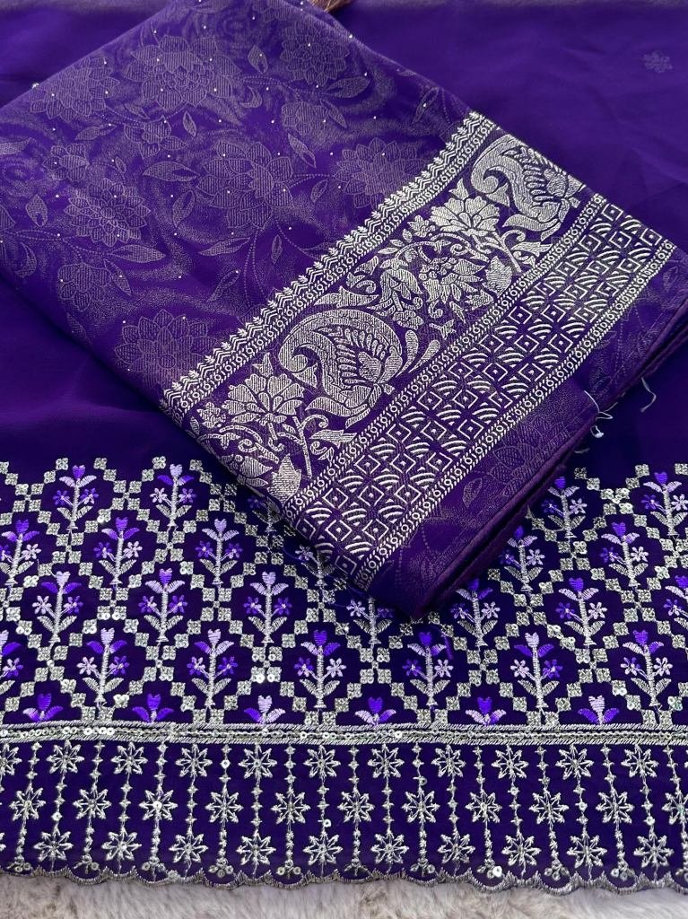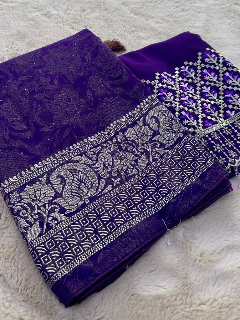Fabric : Georgett fabric Work :- Additional Smoke work With beautiful leather foil with heavy tone to tone embroidary blouse.Saree cut :- 5/50Blouse piece: 0/80Occasion :- Wedding, Festival