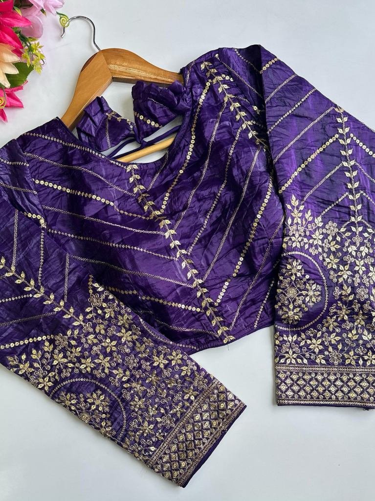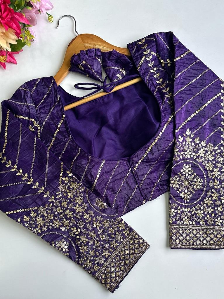 A Beauty Of Golden Embroidery Work With Sequence All Over BlouseFabric:- Pushpa Silk Size:-38 Up To 42Selves: 18+ SleevePad: YesHeight:15 inch+