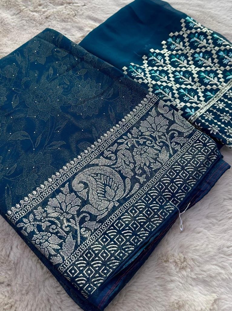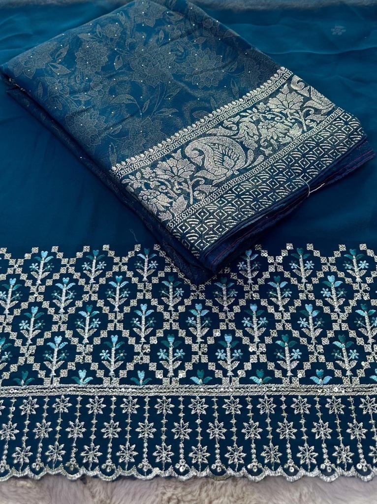 Fabric : Georgett fabric Work :- Additional Smoke work With beautiful leather foil with heavy tone to tone embroidary blouse.Saree cut :- 5/50Blouse piece: 0/80Occasion :- Wedding, Festival