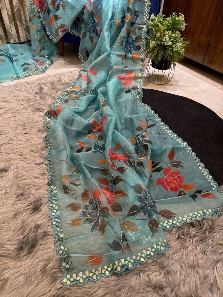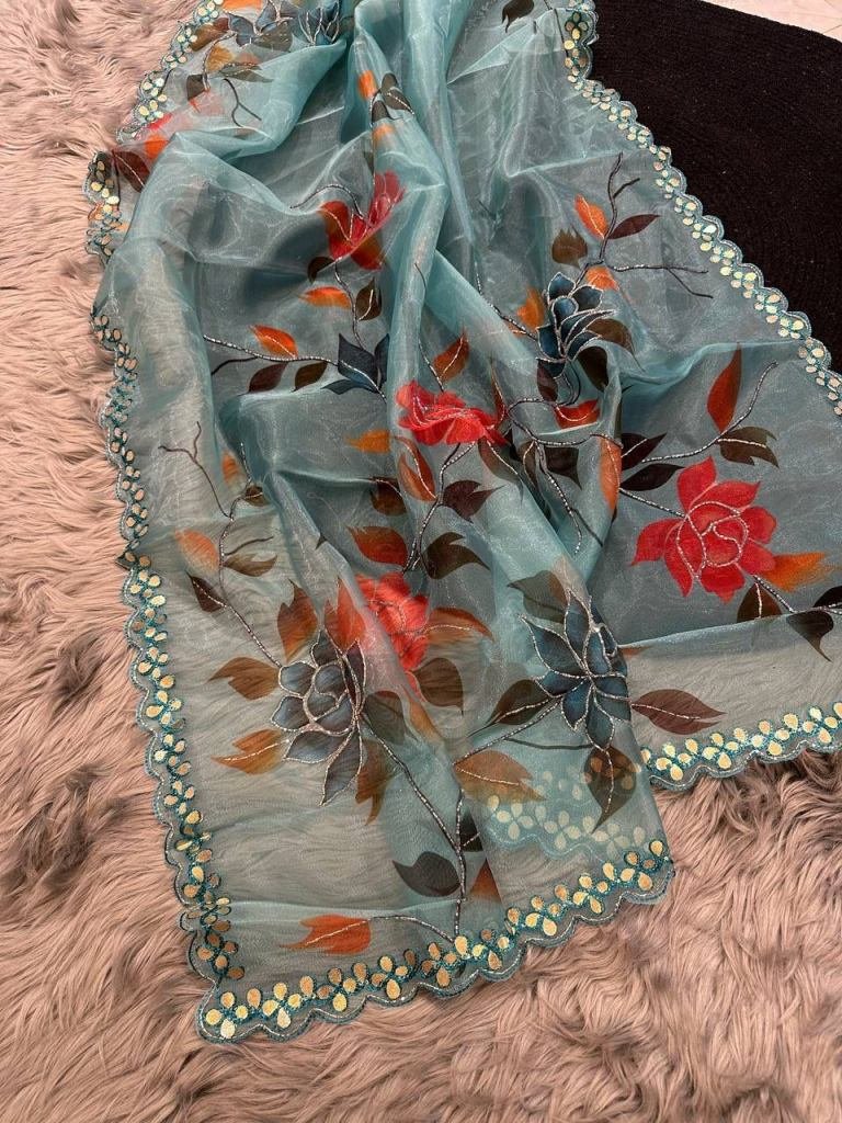 Fabric :- OrganzaWork :- HandworkPrint :- Floral PrintedSaree Length :- 5.5Blouse Length :- 0.8Occasion :- Wedding, Party Wear