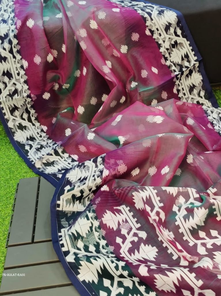 Fabric :- Muslin Pattern :- IkkatColor :- RaniOccasion :- Wedding, Festival, PartySaree Length :- 5.5Blouse piece :- 0.8