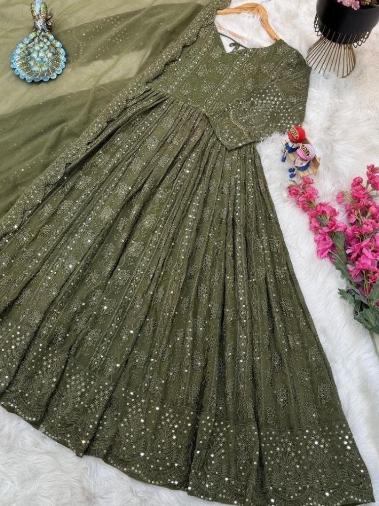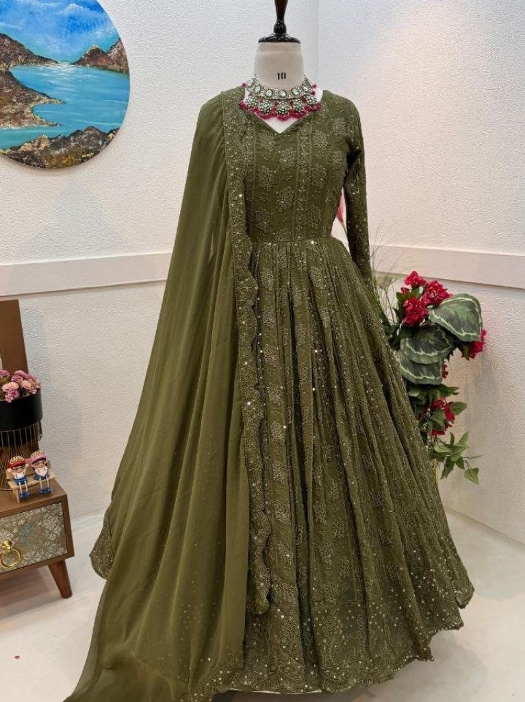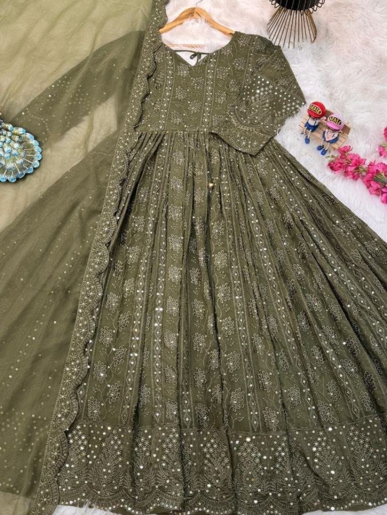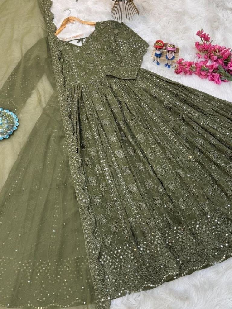 Fabric : fox georgetteWork : siqunce embroideryLength : 55Flir : 3 mtrNeck : roundSleeves : 20 inchdupattaFabric: Fox georgetteWork : Embroidery siqunceLength : 2.20 mtr