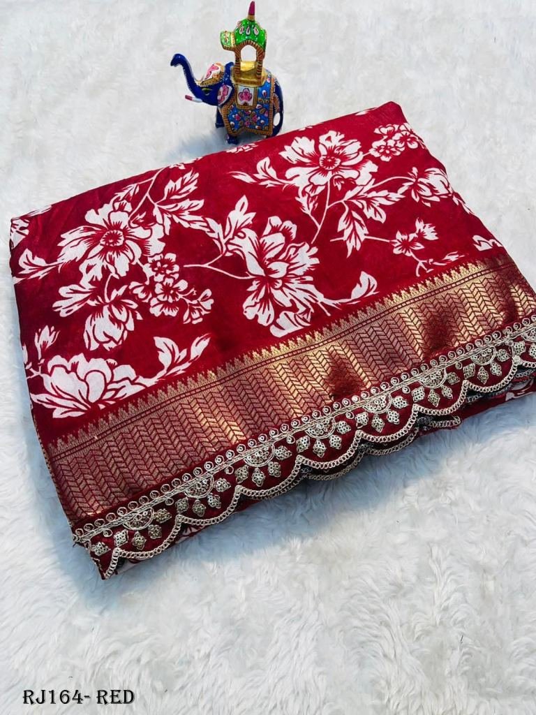 Beautiful Benny crape saree with all over floral design along with scallop maggam work lace at border