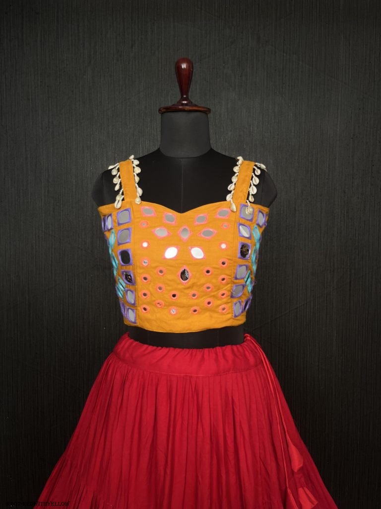 Red Real Mirror Work Rayon Navratri Lehenga Choli With Yellow Blouse