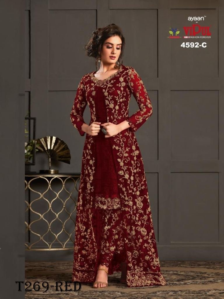 • Wine Embroidery Work Vaishnavi Net Suit Set