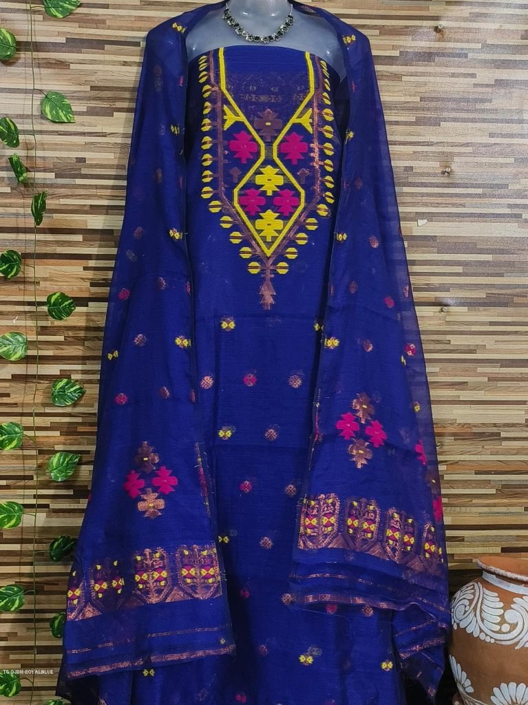 NEW EXCLUSIVE SUTS PCS Dhakai JamdaniMost demanding productjamdani suits 2 pcsFabric :- JamdaniTop Meter :- 2.5 MeterDupatta :- 2.5 MeterColor :- Royal BlueOccasion :- Wedding, Festival, Regular, Function,