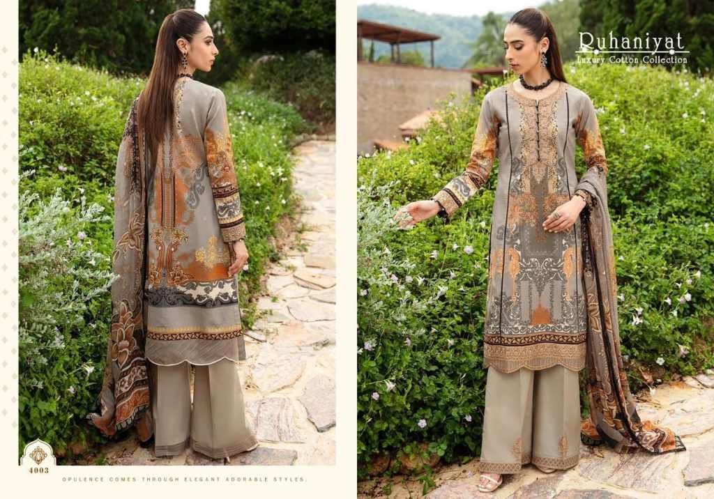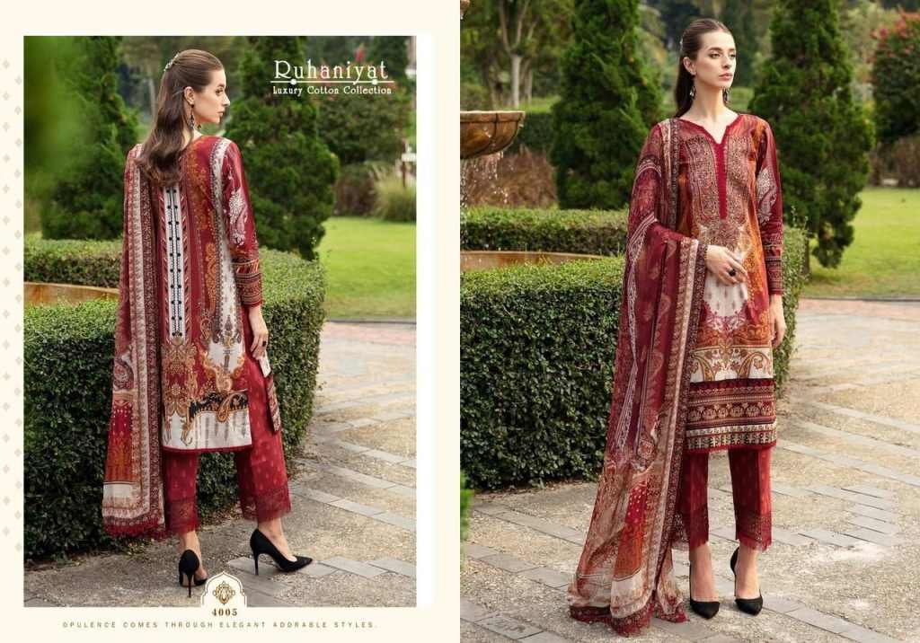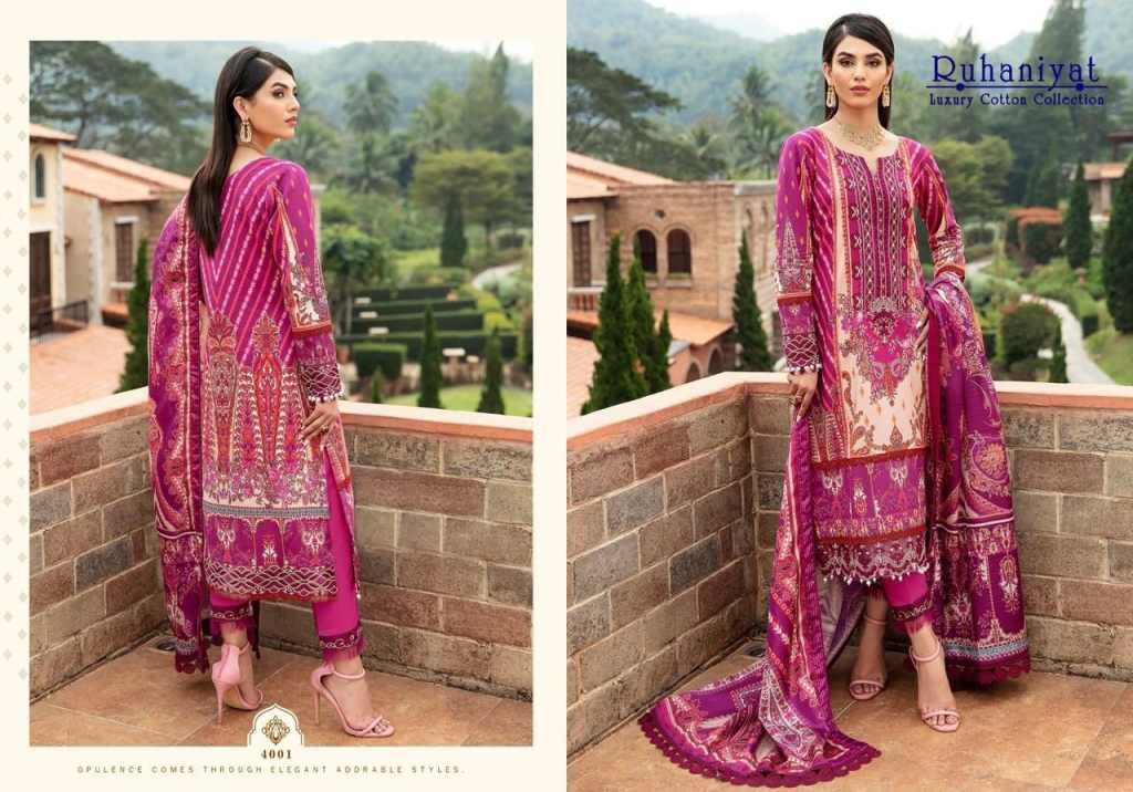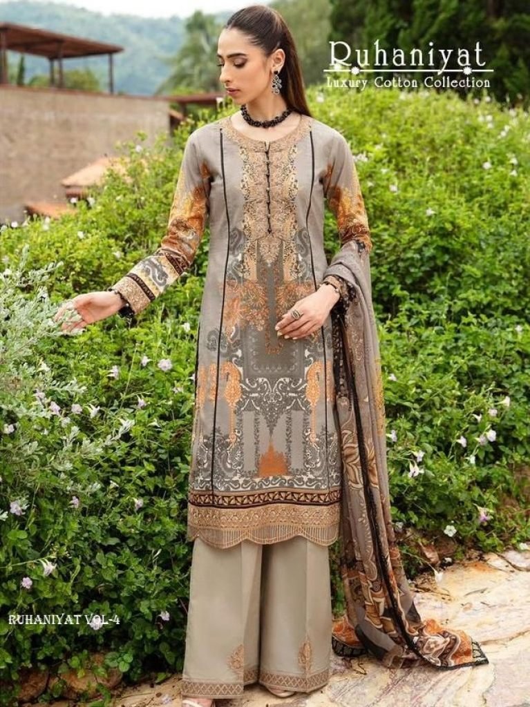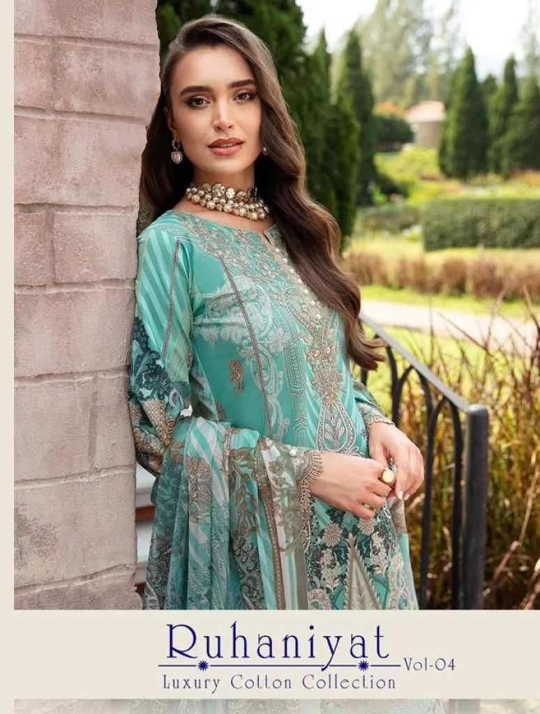 Ruhaniyat Vol-4Exclusive 100 Karachi Cotton CollectionFabrics Details And Cut :-Top :-pure Cotton 2/40 MtrBottom :- Cotton 2/00 Mtr ApproxDupatta :-pure Cotton Mal MalPouch With Bag PakingBeautiful 06 Designs Collection