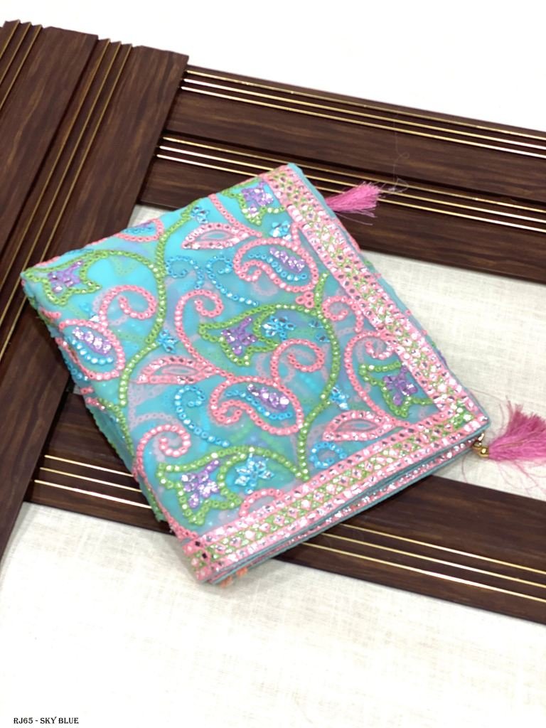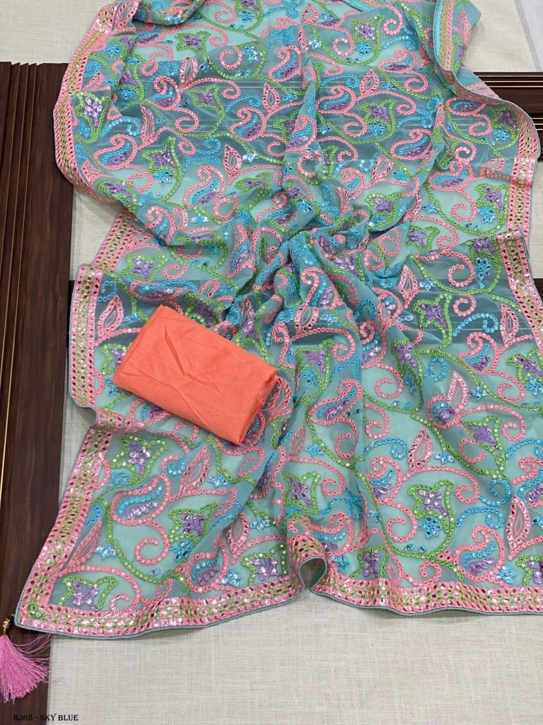 Designer Embroidery Work Saree With Soft Georgette Fabric With Designer Embroidery Thread With Mirror Work With Piping and Contrast Matching Blouse With Tassels on Pallu