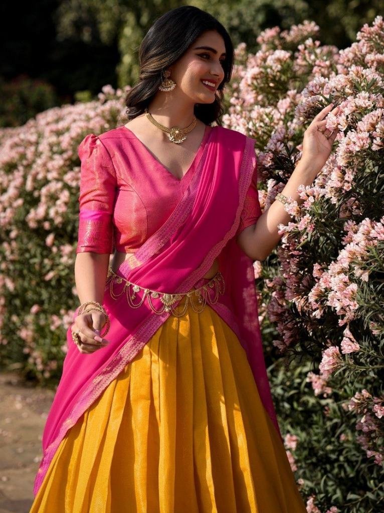 South Indian Style Mustard Colour Half lehenga With Pink Dupatta