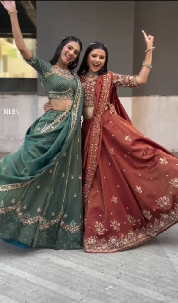 Stylish Chinon Green Sequence Lehenga by Fab Funda