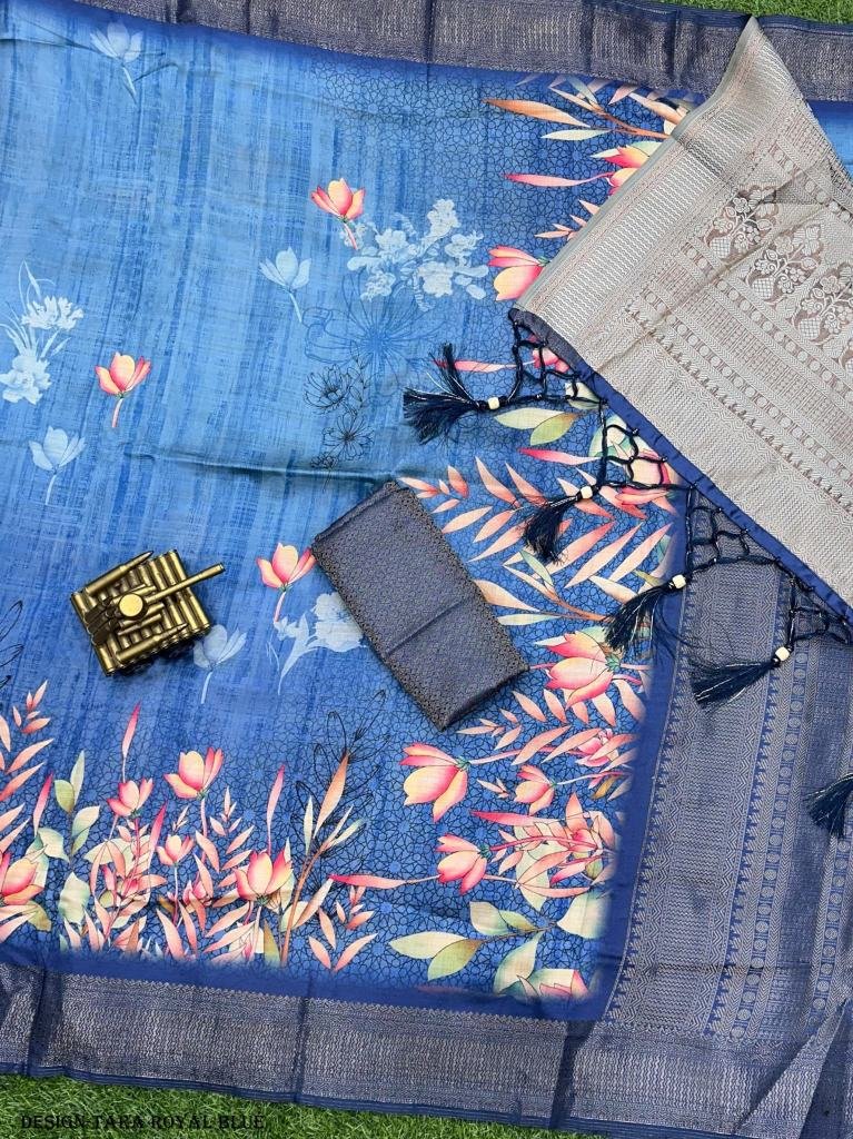 Saree- Digital 3D print with jacquard in pallu, blouse & border with tussels in pallu.