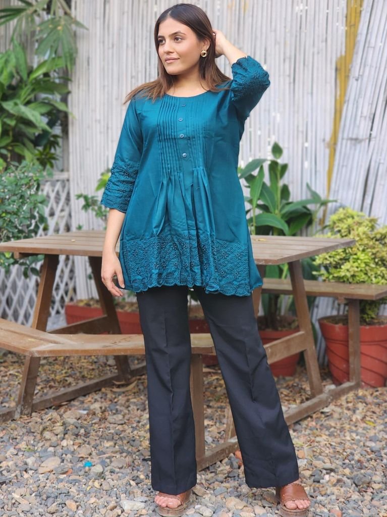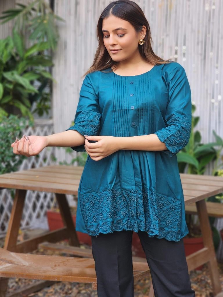 TopsSlim fit short kurti, Can be worn with denim jeansFabric: cotton With Thread Work Size: M 38, L 40, XL 42, Xxl 44Length:29Sleeve Length : Three-Quarter SleevesPattern : plain