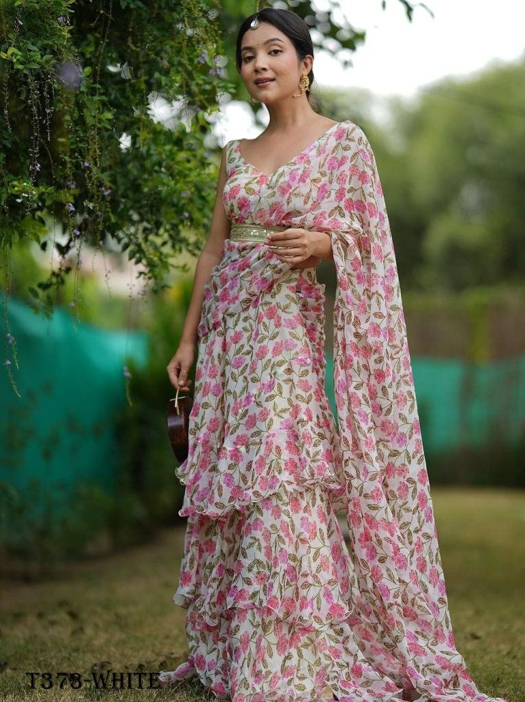 One More Super Hit Georgette Ruffle Ready To Wear Saree With Readymade Blouse Design Launch