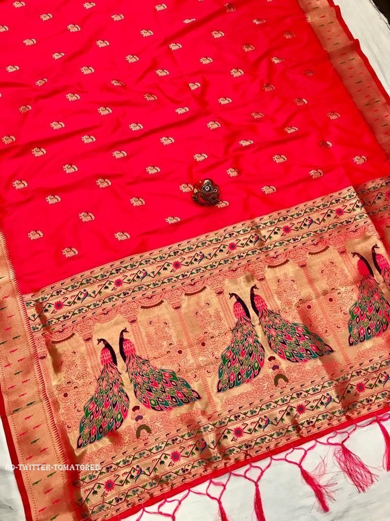 Fabric :- Super Soft Kasturi silk paithani saree with beautiful gold jari weaving peacock and munia on border attached with attractive minakari peacock on Pallu with tussal.