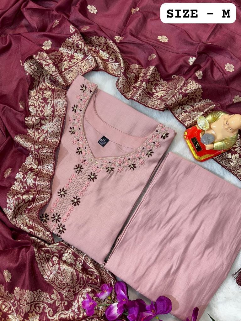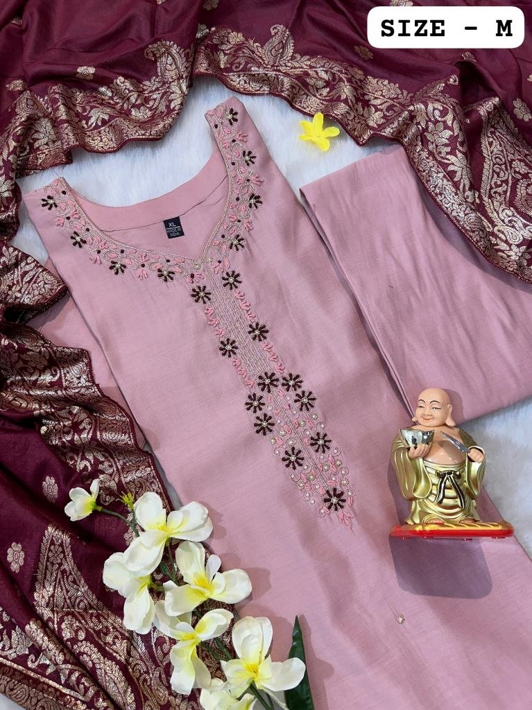 Featuring Muslin Viscose Suit Which Has Beautiful Handwork Detailing And Banarasi Dupatta. It Is Very Easy, Breezy And Comfortable As It Looks. It Is Paired With Matching Pants And Dupatta.