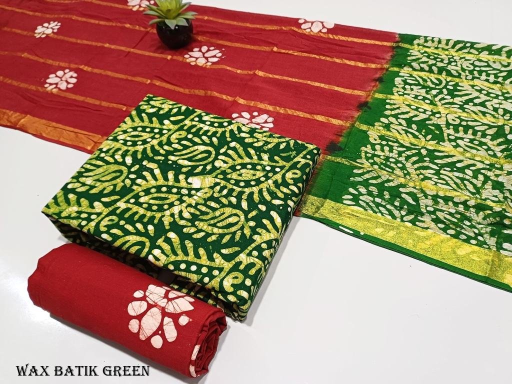 WAX BATIK Material Pure Cotton Dress MaterialTop : Heavy Cotton (2.25mtr).Bottom : Heavy Cotton (2.25 mtr).Dupatta : Cotton (2.25 mtr).Note: Material OnlyUnstitched
