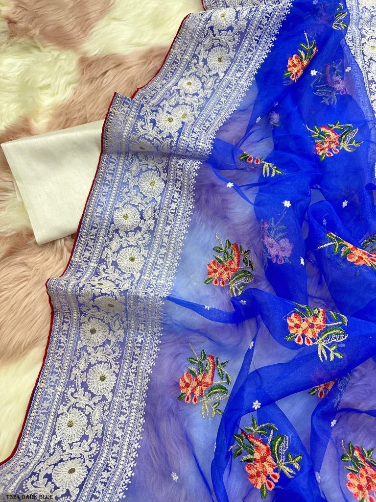 Superb Soft Refined Organza Silk Saree With Lucknowi Thread Chikankari Work border and multiple color viscos work in body too With Banglori Raw Silk Blouse