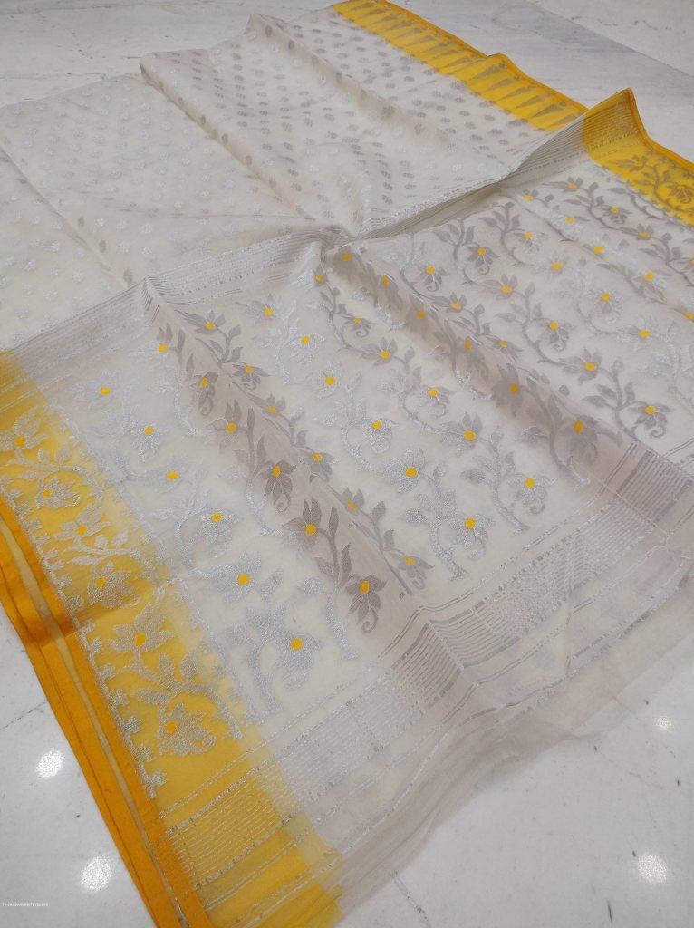 White And Yellow Border Soft Pure Maslin Dhakai Jamdani Saree
