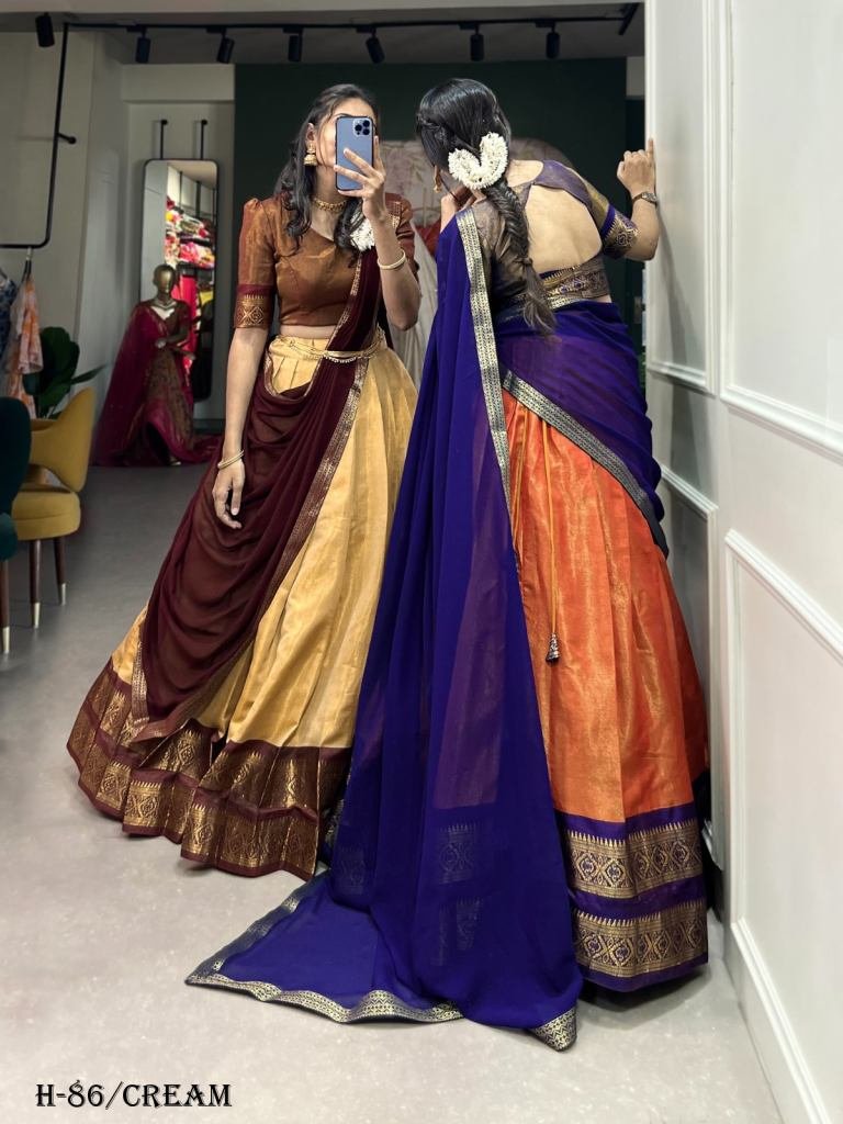 Women Kanchipuram Silk Cream Lehenga Choli With Brown Dupatta