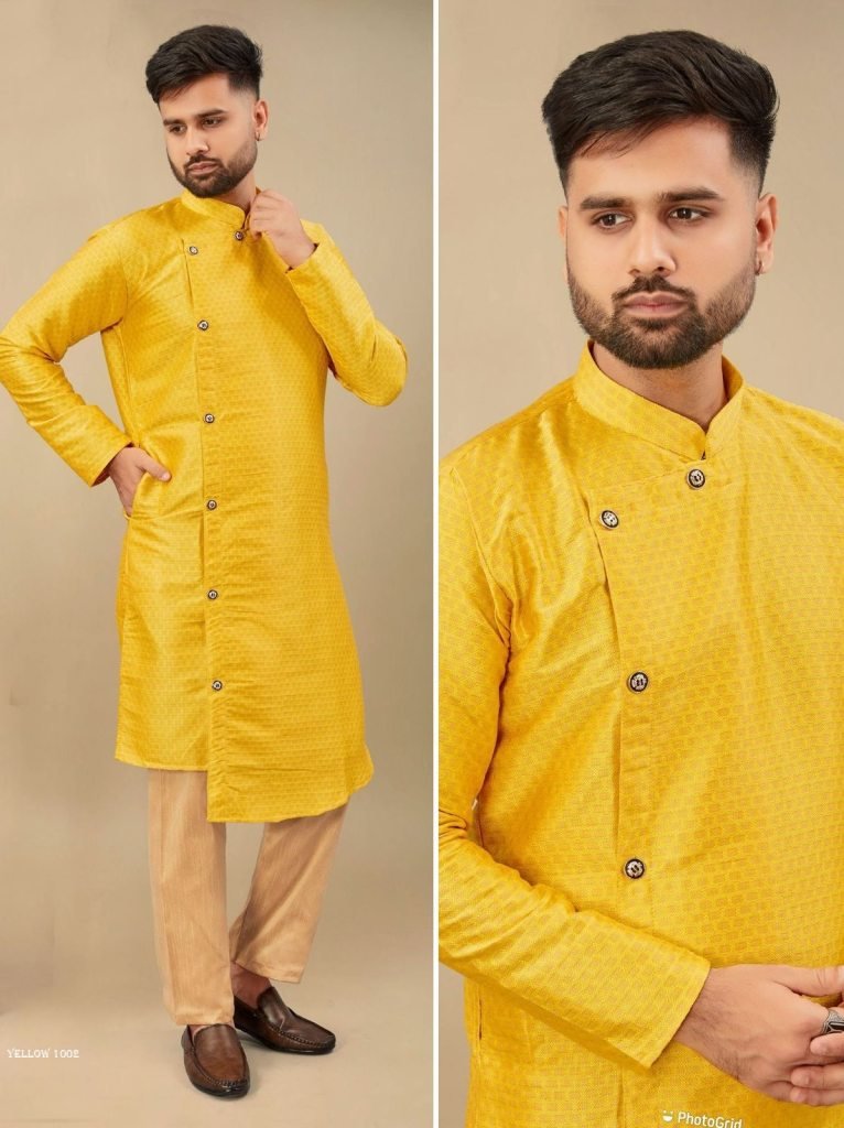 Cross KurtaCross button Kurta + Pyjama For all Types of occasions in 7 ColorsFabric: Silk Jacquard Size : M | L | XL | XXL Both Side PocketsKurta + Pyjama