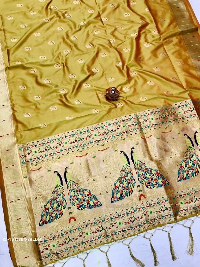 Fabric :- Super Soft Kasturi silk paithani saree with beautiful gold jari weaving peacock and munia on border attached with attractive minakari peacock on Pallu with tussal.