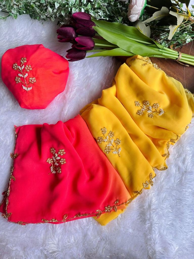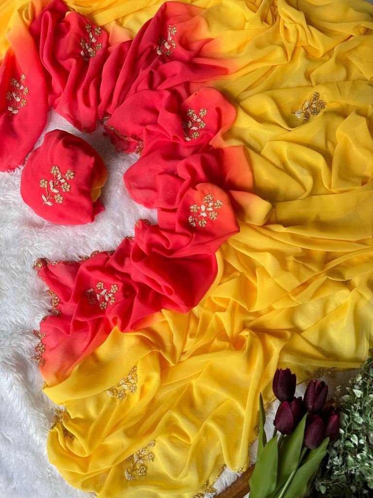 Fabric :- Georgette Work :- HandworkColor :- All in Dual ColorSaree Length :- 5.5 mtrBlouse Length :- 1.0 mtr